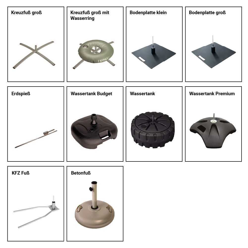 Damit die Fahne stabil und sicher steht – egal ob auf Asphalt, Rasen, Sand oder Schnee - ist die Wahl des richtigen Standfußes entscheidend. Für die Beachflag Drop sind verschiedene Kreuzfüße, Bodenplatten, ein Wassertank, ein KFZ-Fuß und ein Betonfuß erhältlich, wenn die Fahne auf den Boden gestellt werden soll sowie ein Erdspieß für die Verankerung im Boden. Bei Kreuzfüßen und Bodenplatten empfiehlt es sich je nach Einsatzort und Größe der Beachflag, für eine optimale Stabilität einen Wasserring zur Beschwerung zu verwenden.